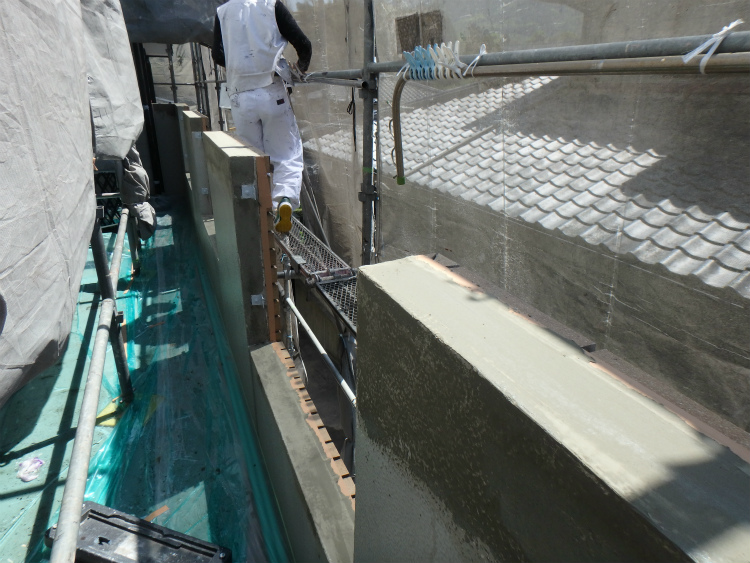バルコニー手摺壁の浮いている塗膜を削った箇所の補修から作業開始。