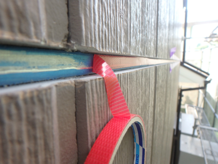 このジョイントの底に見える青くみえるテープはボンドブレーカーと呼ばれるもので、目地底の部材(ハットジョイナー)とシーリング材との接着を防いでいます。
