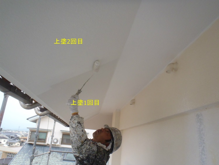 養生を行った区画の軒天の上塗1回目の塗布を行います。